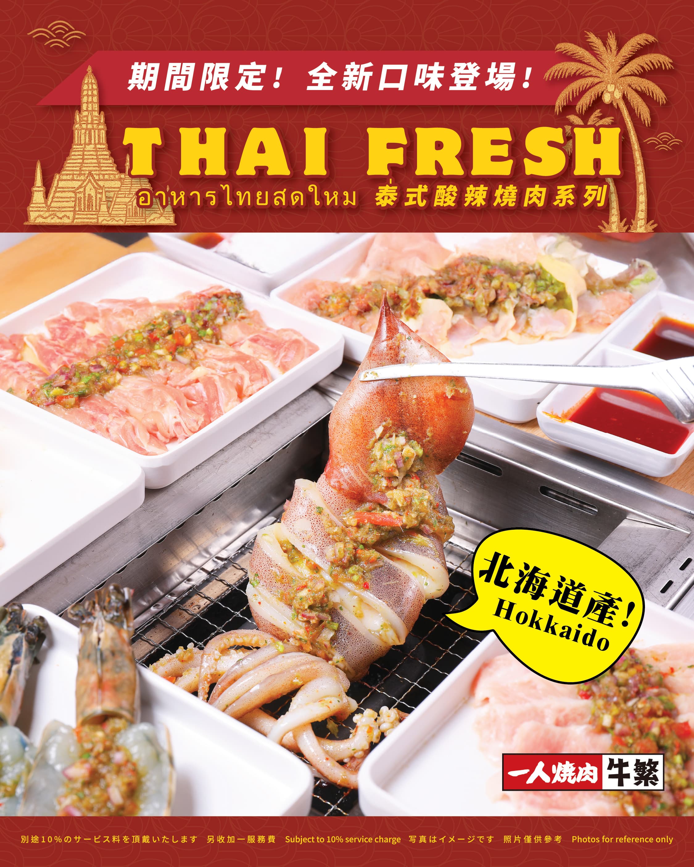 東京過江龍人氣燒肉店「牛繁」一人燒肉套餐,每個位置均設獨立燒烤爐,享受不一樣嘅⽇式燒肉體驗!牛繁最近推出充滿地道特色嘅泰式酸辣燒肉系列,新品包括原條魷魚、特大黑虎大蝦等,鮮味十足嘅燒海鮮配上又酸又辣的醬汁,非常惹味!